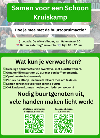 We zijn lekker bezig in de Kruiskamp! Kom je zaterdag 1 november mee doen met de buurtopruimactie? We starten om 10.00 uur met een kopje koffie, thee en natuurlijk een lekker koekje.